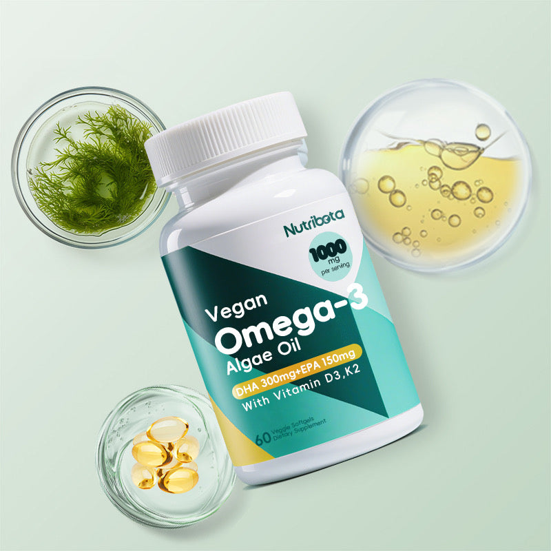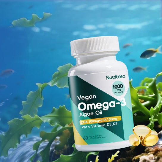 Nutribota Vegan Omega 3 Softgels | 1000mg Algae Oil as Fish Oil Alternative | 300mg DHA + 150mg EPA | Omega 3 Supplements with Vitamin D3 & K2 for Brain, Eye, Skin& Immunity | 60 Count