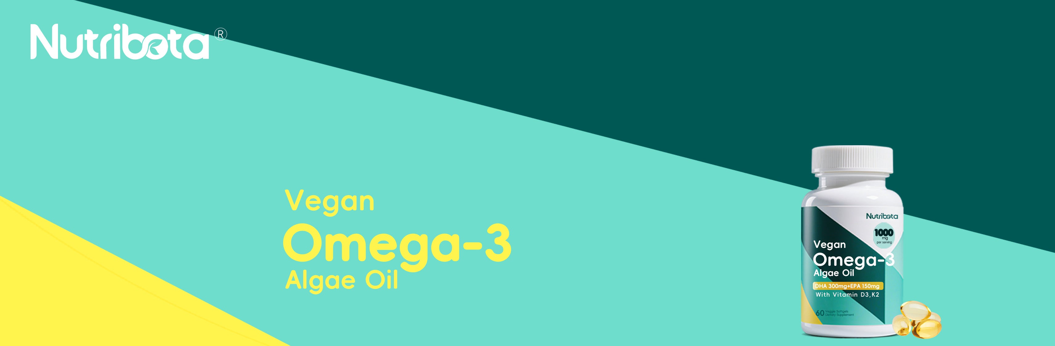 Nutribota Vegan Omega 3 Softgels | 1000mg Algae Oil as Fish Oil Alternative | 300mg DHA + 150mg EPA | Omega 3 Supplements with Vitamin D3 & K2 for Brain,Eye, Skin& Immunity | 60 Count